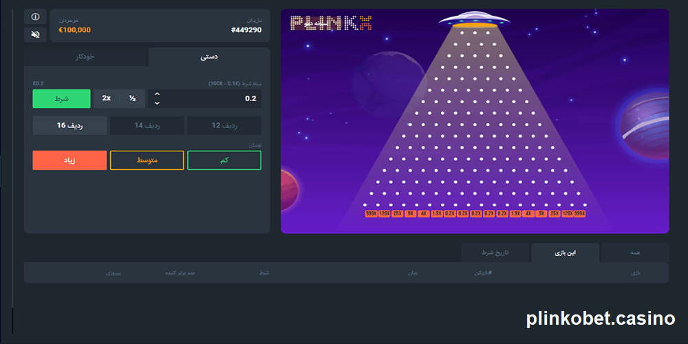 - انتخاب سطح ریسک: پس از انتخاب مبلغ شرط، باید سطح ریسک خود را تعیین کنید. بسیاری از نسخه های بازی پلینکو سه حالت مختلف دارند: ریسک پایین، متوسط و بالا. هر چه ریسک بیشتر باشد، ضریب برد نیز افزایش می یابد، اما احتمال باخت هم بیشتر خواهد شد.